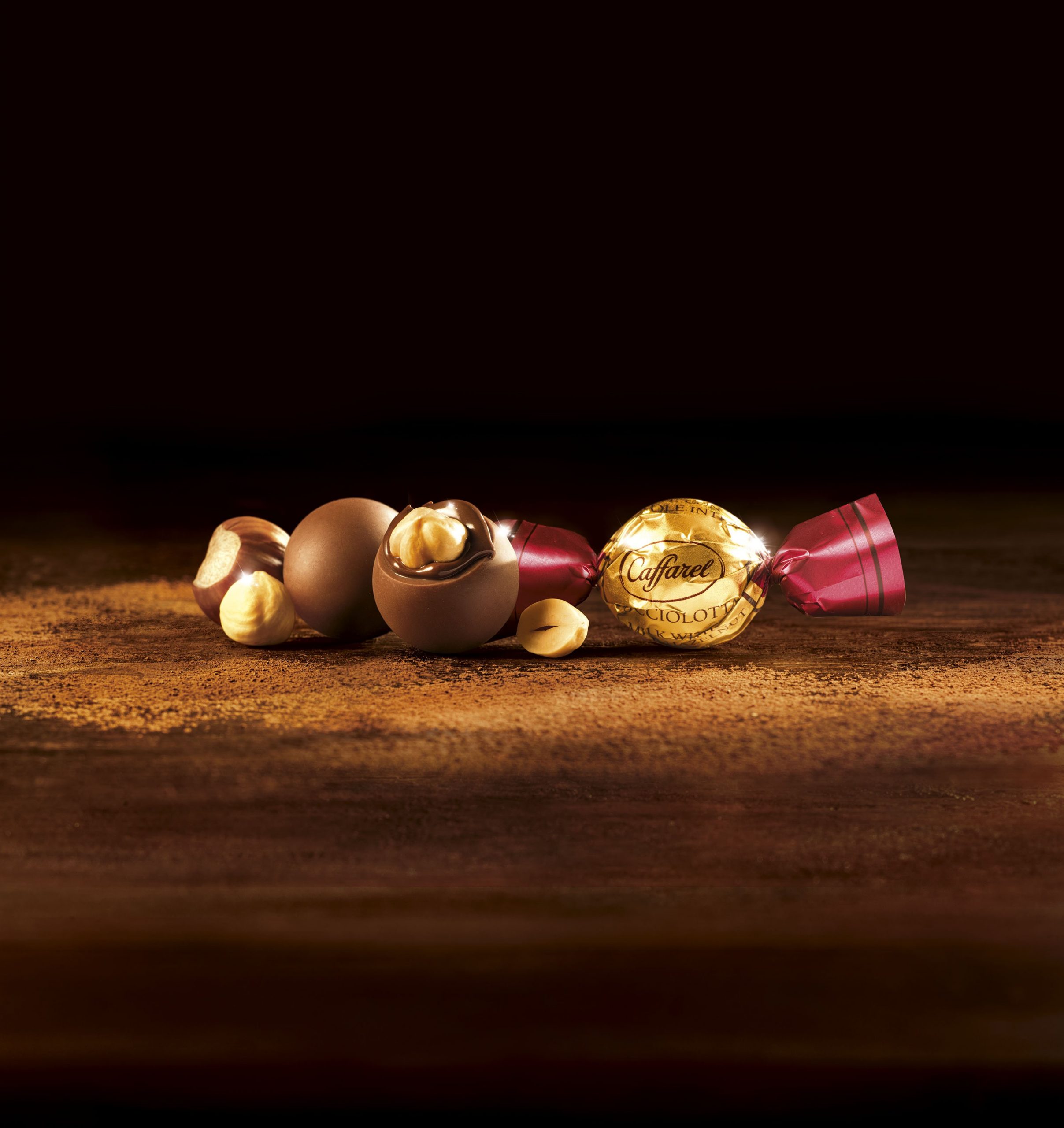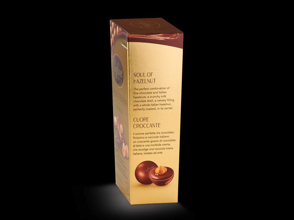Zwei Schichten cremiger Gianduja-Schokolade, die eine weiche Haselnusscreme umgeben, sorgen für ein intensives samtiges Gefühl.